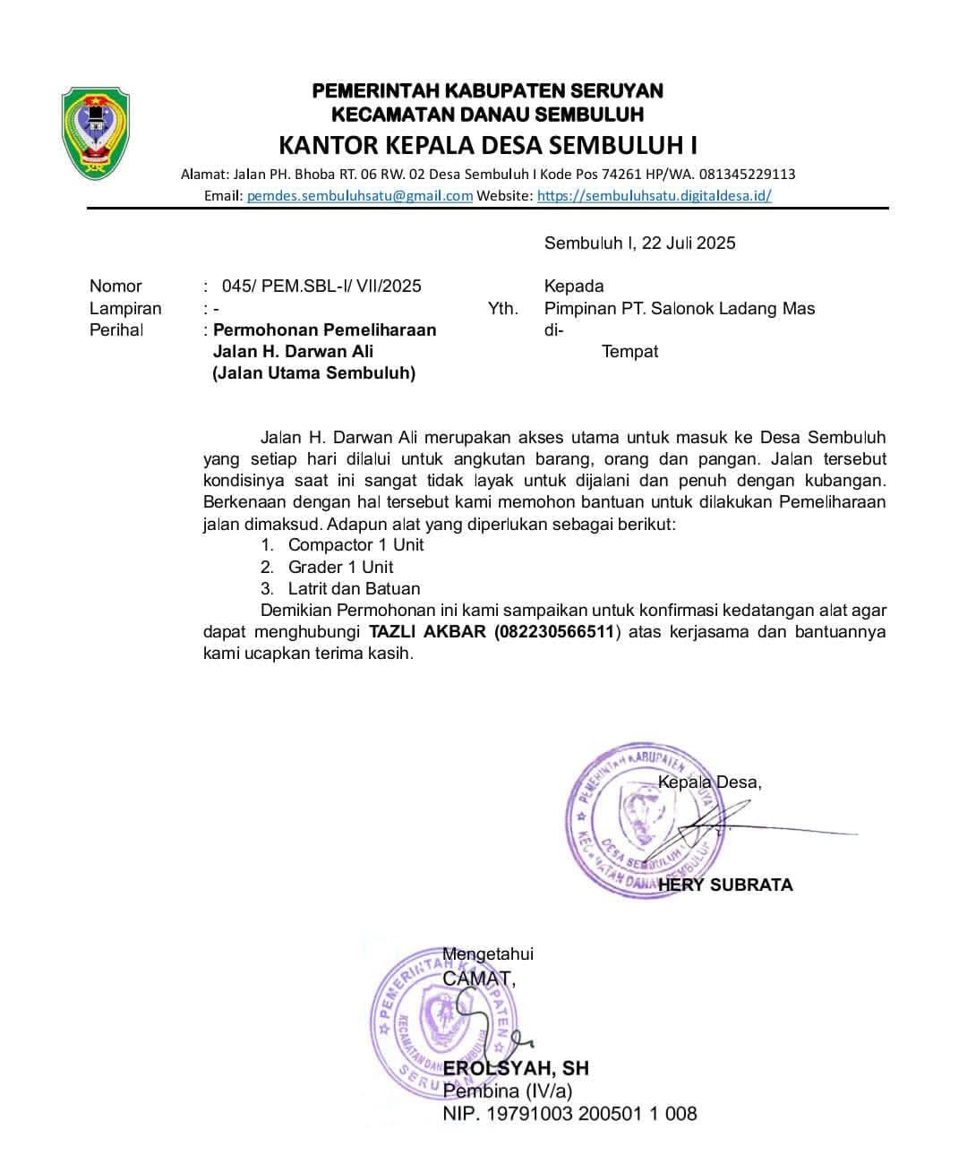 Terima Kasih kepada PT. Salonok Ladang Mas sudah menanggapi Surat Permohonan Kepala Desa Sembuluh I perihal Pemeliharaan Jalan Darwan Ali (Jalan Masuk Desa Sembuluh).
